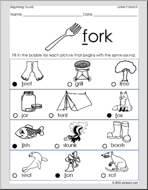Use this ‘Beginning Sounds: Match – Letter F’ printable worksheet in the classroom or at home. Your students will love this ‘Beginning Sounds: Match – Letter F’. Fill in the bubbles next to the pictures that begin with the ‘f’ sound. This is a great activity for pre-readers and pre-writers.