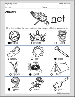 Use this ‘Beginning Sounds: Match – Letter N’ printable worksheet in the classroom or at home. Your students will love this ‘Beginning Sounds: Match – Letter N’. Fill in the bubbles next to the pictures that begin with the ‘n’ sound. This is a great activity for pre-readers and pre-writers.