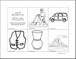 Match the b/w pictures of words that start with the letter V to their color counterparts. Use alone or in conjunction with our other “initial letter” sets for a great memory game.
