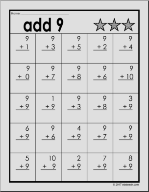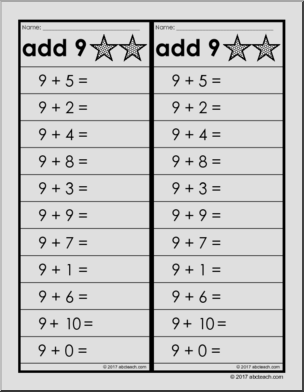 Add 9. Practice basic fact fluency with this set that includes 3 difficulty levels: strips with horizontal facts in numerical order, strips with horizontal facts in mixed order, and full page of vertical facts.