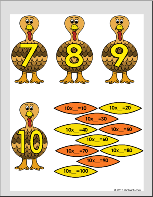 A colorful folder game for 1-2 players. Match the feather to the turkey that provides the missing factor. Includes directions for game play and assembly, printable folder game boards, and feathers with missing factor equations. Laminate for a fun, reusable classroom game.