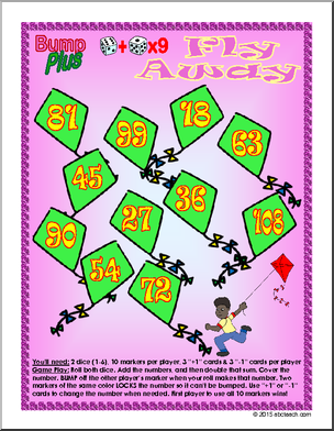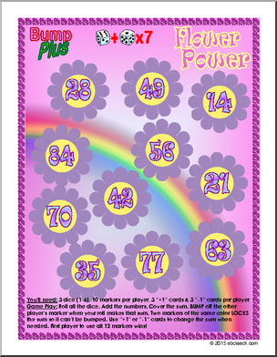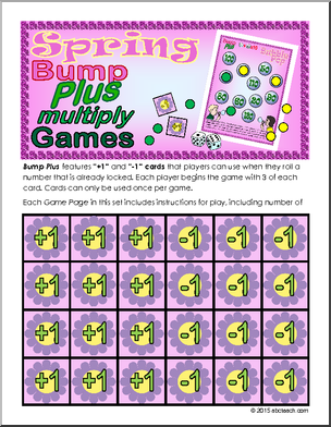 A new plus to the popular Bump game where players roll dice, multiply, and cover the sum. This colorful spring-themed set includes 5 multiplication games: mixed facts 1-6, times 7, times 8, times 9, and times 10. Laminate for a fun, reusable classroom game.