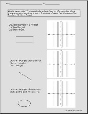 This set includes a poster for your convenience and two worksheets. Students are asked to draw on a grid an example of rotation, reflection and transition. They also are asked to show an example of resizing.