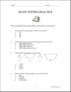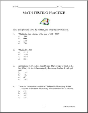 This Math (level 4) Testing Practice is perfect to practice math skills. Your elementary grade students will love this Math (level 4) Testing Practice. Formatted like a standardized test, this 6 page document tests math skills such as addition, multiplication, estimation, congruence, division, even/odd numbers, perimeter, units of measurement, place value and more. These are […]