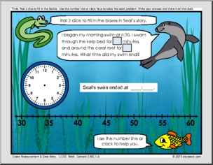 Six colorful math mats for practice in adding and subtracting minutes, adding weights, representing data on a bar graph and line plot, measuring lengths, and finding area and perimeter. Printable manipulatives are included. CC: Math: 3.MD.1-8
