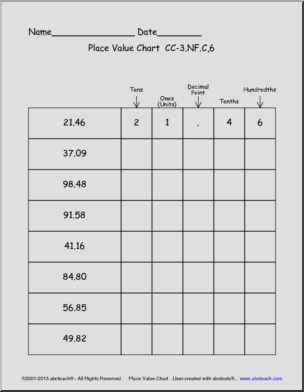 Two examples of place value up to tens, with two decimal places. Includes answer key. CC: 3.NF.C.6 Common Core: 6.NS.3