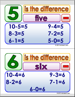 These colorful math posters are a quick reference for subtraction facts listed by differences 1-10. Ten pages can be displayed seperately or attached together to form a large poster.