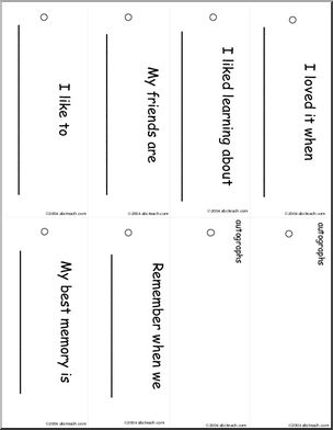 Use this ‘Booklet: Memory Strips’ printable worksheet in the classroom or at home. Your students will love this ‘Booklet: Memory Strips’. 16 card strips for students to cut out, complete, and connect on a ring for a flip book of happy memories, from what they learned to what they loved.