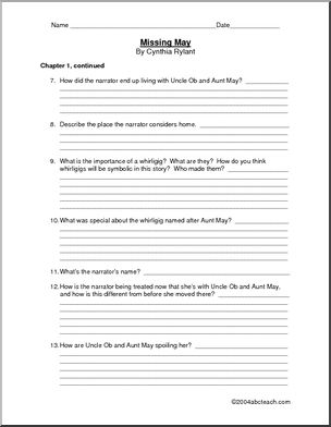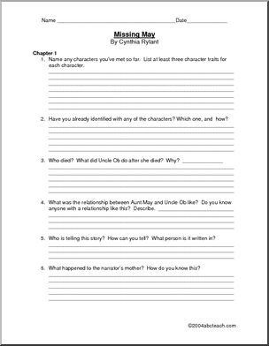 Use this ‘Book: Missing May, chapter 1 (upper elem/middle)’ printable worksheet in the classroom or at home. Your students will love this ‘Book: Missing May, chapter 1 (upper elem/middle)’. Thoughtful short essay questions to get students started with Cynthia Rylant’s 1993 Newbery-winning tale of grief and hope.