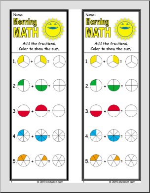 One full week of morning math practice, this set features colorful illustrations, and includes 5 pages of practice in adding and subtracting like fractions, plus answer keys. Great for reinforcing basic fraction skills.