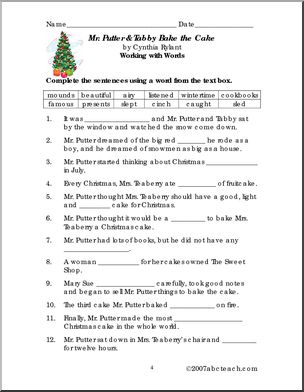 Use this ‘Book: Mr. Putter and Tabby Bake the Cake (primary)’ printable worksheet in the classroom or at home. Your students will love this ‘Book: Mr. Putter and Tabby Bake the Cake (primary)’. Word search, word scramble, cloze exercise, short answer and true/false comprehension questions review Cynthia Rylant’s story of a Christmas cake.