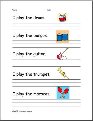 Use this ‘Early Writer Rebus: Music (color)’ printable worksheet in the classroom or at home. Your students will love this ‘Early Writer Rebus: Music (color)’. “I play the [guitar].” Page 1: Read the sentence. Match the picture to the word. Write the word. Page 2: Copy the sentence.