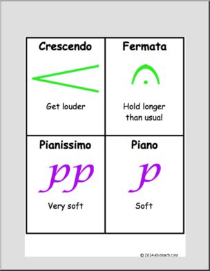 A set of 12 vocabulary cards that define and illustrate eleven musical notation terms: repeat, accent, decrescendo, crescendo, fermata, pianissimo, piano, mezzo piano, mezzo forte, forte, fortissimo.
