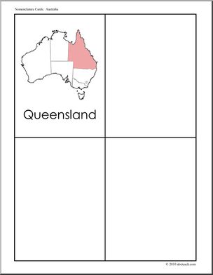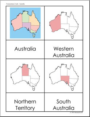 Montessori nomenclature: two sets of cards of Australia. Each set includes a full color map and maps with eight states and territories named and highlighted in red.