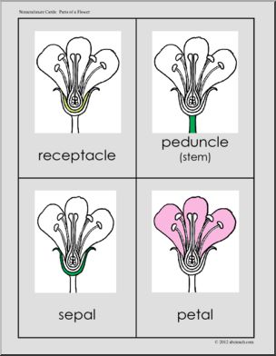 A set of labeled color-highlighted three-part matching cards illustrating the parts of a flower.