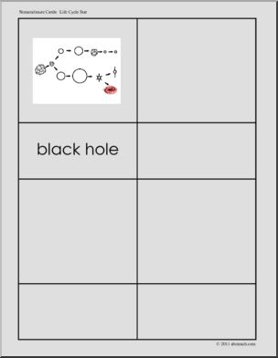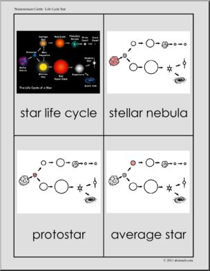 A color illustration and a red highlighted set of three part nomenclature cards identifying the twelve parts of the life cycle of a star.