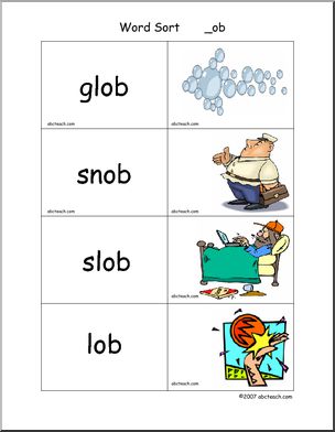 Use this ‘Word Sort Center: -ob Words’ printable worksheet in the classroom or at home. Your students will love this ‘Word Sort Center: -ob Words’. Cards with words and matching pictures for words ending in -ob; these can be used in matching games and word sort center activities.