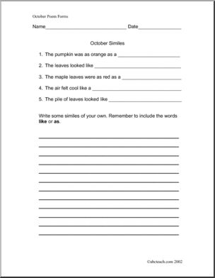Use this ‘Poetry Prompt: October (elementary)’ printable worksheet in the classroom or at home. Your students will love this ‘Poetry Prompt: October (elementary)’. Word prompts including six poem forms, acrostics, similes, rap.