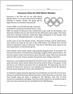 Past Olympics: Comprehension: 2010 Olympics (elem)