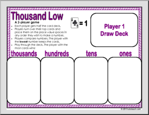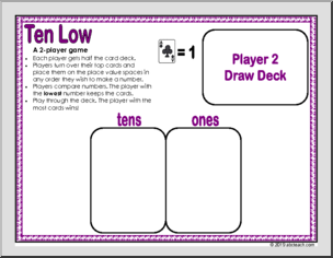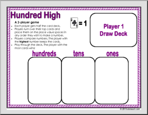 Five fun games using playing cards (ace-9) to reinforce place value skills: a sorting game, one single-player game, and three 2-player games. Laminate for a fun, reusable classroom game.