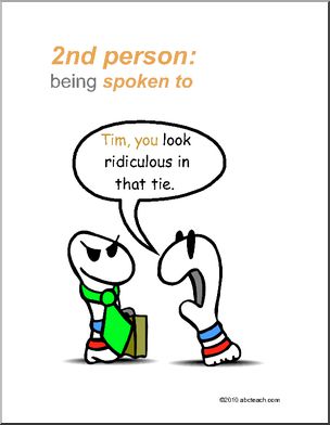 Three posters graphically illustrating the grammatical concept of first, second and third person.