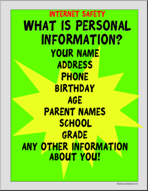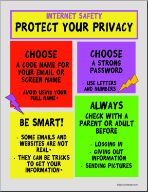 This set of 5 color posters describe key ideas of internet safety: Digital Footprint, Protection and Privacy, Personal Information, Stranger Danger and Online Respect. An excellent way to begin this important conversation with older students.