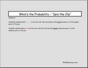 This Probability (elem, upper el, middle) is perfect to practice probability skills. Your elementary grade students will love this Probability (elem, upper el, middle). Color the probability pie. Attach a paper clip. Spin the clip! Write the color the clip stops on each time. Common Core: Grade 6 Statistics and Probability: 6.SP.A.1, 6.SPA.2