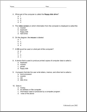 Multiple-choice quiz about computer terms, including a diagram of computer and parts.