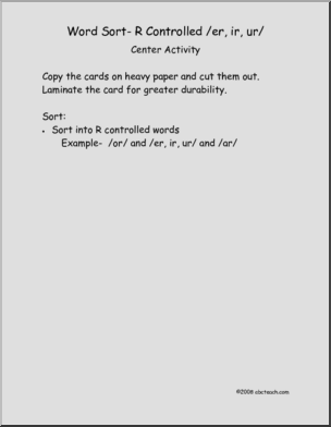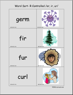 Use this ‘Word Sort Center: R-Controlled (er/ir/ur) Words’ printable worksheet in the classroom or at home. Your students will love this ‘Word Sort Center: R-Controlled (er/ir/ur) Words’. Cards with words and matching pictures for r-controlled words (er/ir/ur); these can be used in matching games and word sort center activities.