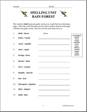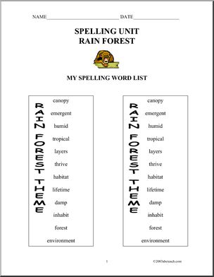 Use this ‘Spelling: Rain Forest (elementary)’ printable worksheet in the classroom or at home. Your students will love this ‘Spelling: Rain Forest (elementary)’. Studying rain forests? Learn vocabulary with this fun set: a word search, dictionary skills, crossword, and more. From “canopy” to “thrive”.