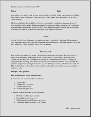 This readig comprehension covers the life and death of Joan of Arc. Includes questions and a writing prompt.