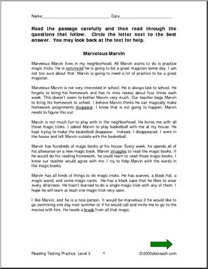 Use this ‘Testing Practice: Reading (Level 3)’ printable worksheet in the classroom or at home. Your students will love this ‘Testing Practice: Reading (Level 3)’. Formatted like a standardized test, this 11 page document tests reading skills. These are approximately skills tested in third grade, although state standards vary widely.