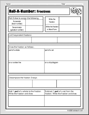 Roll dice to make a number for skill practice. Includes pages for Decimal, Fraction, Improper Fraction, and Mixed Number. Decimal skills include: place value, rounding, addition, subtraction, money, doubling, number line, and writing in standard form, word form, expanded form, and expanded notation. Fraction skills include: numberator, denominator, word form, equivalents, decomposing, conversation, addition, subtraction, […]