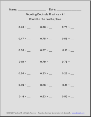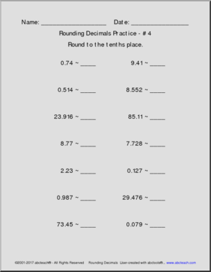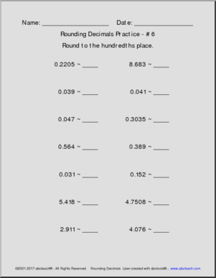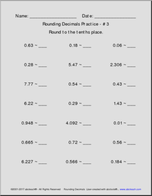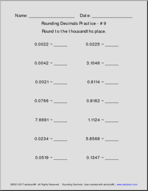 10 pages of practice in rounding decimals to the nearest tenth, hundredth, or thousandth. Place values decrease through packet. Created with our abctools Math Worksheet Generator. CC: 5.NBT.A.4