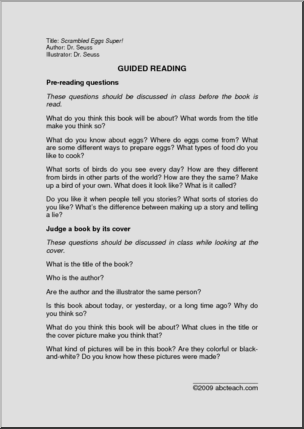 Use this ‘Guided Reading: Scrambled Eggs Super (k-4)’ printable worksheet in the classroom or at home. Your students will love this ‘Guided Reading: Scrambled Eggs Super (k-4)’. Suggestions for teachers to guide students during a “read aloud” of Dr. Seuss’s popular story, with pages for students to fill in their own before, during, and after […]