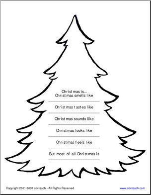 [member-created using abctools] Trace and cut out. This evergreen-shaped shapebook has prompts for students to answer about Christmas.