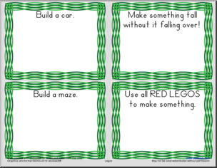 Try this LEGO challenge! Print the cards, and follow the instructions to make something using only building blocks. Or become a member and use the shapebook editor to make your own challenge cards. Created with abctools®