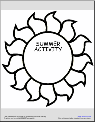 From BARBECUE to TRAVEL, each summer activity word is printed in a sun-shaped shapebook.