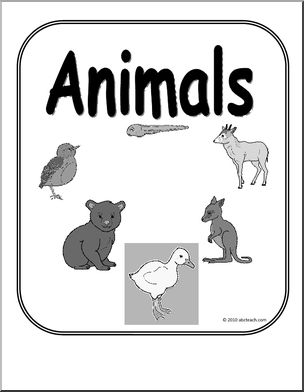 Two classroom sign of word “Animals” illustrated with mammals, fish, and birds. A color and a black and white version.
