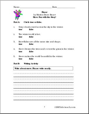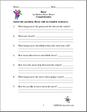 Use this ‘Book: Snow (primary)’ printable worksheet in the classroom or at home. Your students will love this ‘Book: Snow (primary)’. Word scramble, word search, cloze, short answer comprehension questions, true/false and a short writing prompt review Marion Dane Bauer’s factual story about snow.
