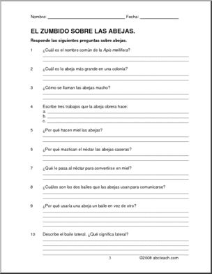 ComprensiÛn de lectura sobre las abejas y la producciÛn de miel para niveles altos de elementaria y de secundaria. Reading comprehension about bees and honey production for upper elementary and secondary levels.