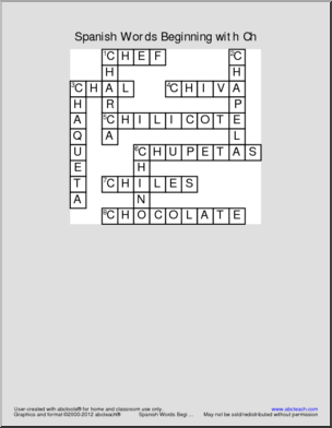 A crossword puzzle of English clues for 12 Spanish words beginning with Ch.