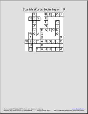 A crossword puzzle of English clues for 12 Spanish words beginning with the letter “r”.