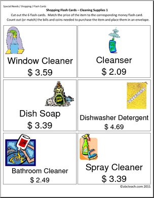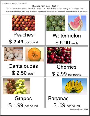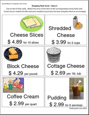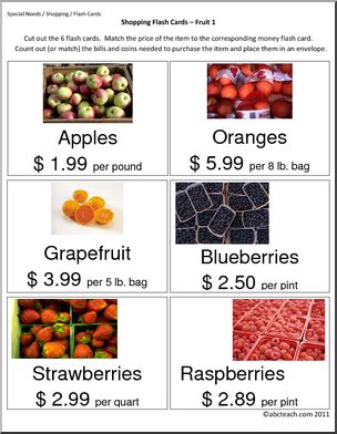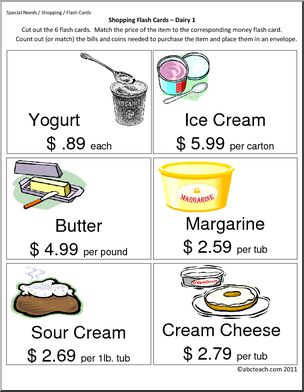 Flashcards to use for practice in making purchases when shopping for grocery items. Each card includes the name of the item, a unit price, and a color illustration or photo. (22 pages, 6 flash cards per page)