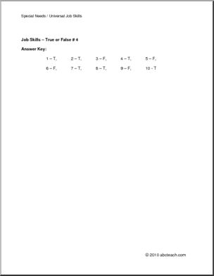 Practice in understanding “Universal Job Skills” consists of 10 realistic job related statements each of which requires a true/false response. This assignment is intended for use with special needs students. (secondary/adult)
