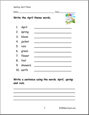 From “April” to “spring”. A list of ten April-themed spelling words, then practice pages including a page for copying the words, ABC order, a spelling test, and room to draw a picture for the month.