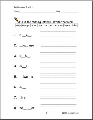 Use this ‘Spelling Level 1, unit 14 (primary)’ printable worksheet in the classroom or at home. Your students will love this ‘Spelling Level 1, unit 14 (primary)’. Worksheets to help learn these spelling words: why, always, nine, are, better, because, been, light. Cloze exercise, word search, missing letters and more!