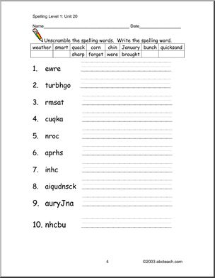 Use this ‘Spelling Level 1, unit 20 (primary)’ printable worksheet in the classroom or at home. Your students will love this ‘Spelling Level 1, unit 20 (primary)’. Worksheets to help learn these spelling words: weather, smart, quack, corn, chin, were, brought.January, bunch, quicksand, sharp, forget. Cloze exercise, word scramble, alphabetical order and more!