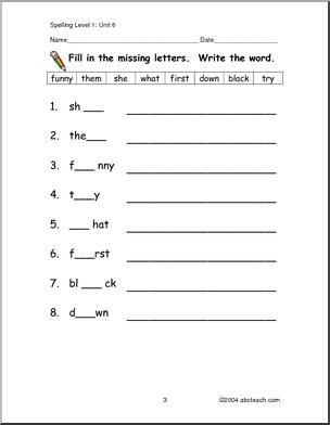 Use this ‘Spelling Level 1, unit 6 (primary)’ printable worksheet in the classroom or at home. Your students will love this ‘Spelling Level 1, unit 6 (primary)’. Worksheets to help learn these spelling words: funny, them, she, what, first, down, black, try. Cloze exercise, word search, missing letters and more!
