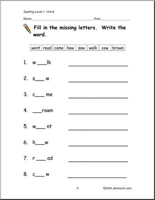Use this ‘Spelling Level 1, unit 8 (primary)’ printable worksheet in the classroom or at home. Your students will love this ‘Spelling Level 1, unit 8 (primary)’. Worksheets to help learn these spelling words: went, read, came, how, saw, walk, cow, brown. Cloze exercise, word search, missing letters and more!